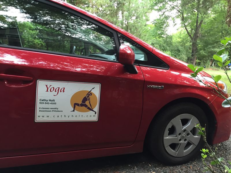 Classes are located at 220 Chatham Business Drive, Pittsboro, NC 27312. Chatham Business Drive is about 1/2 mile east of the courthouse on Hwy. 64, right beside the Postoffice. You’ll see a big building at the end of this road, with a screened porch out front. Drive around the left side to the back of the building and my studio is the 7th door from the right. You’ll see my car(red Prius) parked by the door which has signage relating to yoga and a little Buddha statue near the entrance.
